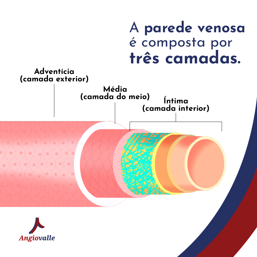 As paredes das veias são mais finas do que as das artérias, chegando a ser mais distensíveis por conta de obter menos fibras elásticas e musculares. A parede venosa é caracterizada por três camadas, sendo elas: íntima, média e adventícia.